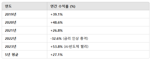 - 2020년(코로나 이후 기술주 급등)과 2023년(AI 열풍)에는 엄청난 상승을 기록 하였습니다.