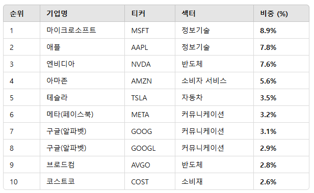 - S&P 500 대비 기술주 비중이 높아서 미래 성장성이 큰 종목들이 많이 포함되었습니다.