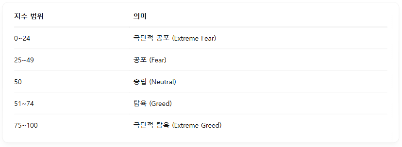 **공포와 탐욕 지수(Fear & Greed Index)**는 미국 CNN Business가 개발한 투자 심리지표입니다. 이 지수는 0~100 사이의 숫자로 구성되어 있으며, 숫자가 낮을수록 ‘공포’, 높을수록 ‘탐욕’ 상태를 나타냅니다.