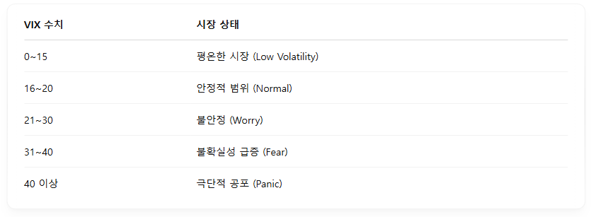 **VIX(Volatility Index)**는 시카고옵션거래소(CBOE)에서 발표하는 시장 변동성의 지표입니다. 흔히 ‘공포 지수(Fear Index)’라고 불리며, S&P 500 옵션의 30일간의 기대 변동성을 반영합니다.