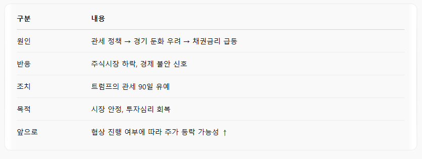 → 결과적으로 관세 90일 유예라는 조치를 통해 시장 불안을 일시적으로 완화하려는 시도로 볼 수 있죠.