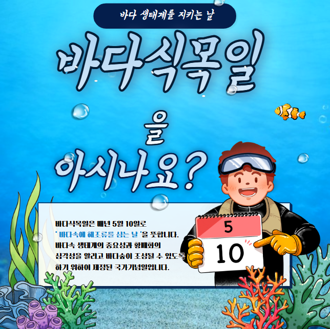 바다식목일은 매년 5월 10일로, 육지의 식목일처럼 바다에 해조류를 심어 바다 생태계를 복원하고 그 중요성을 알리는 날입니다. 2012년 대한민국에서 수산자원관리법 개정을 통해 세계 최초로 제정되었으며, 2013년부터 국가기념일로 지정되어 기념행사가 열리고 있어요.