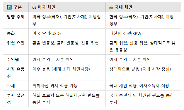아래에서 미국 채권과 국내 채권의 장, 단점, 주의할 점, 미래 전망 등을